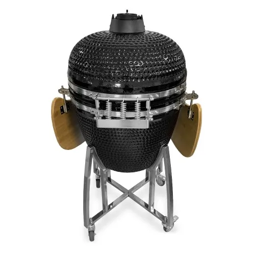 Верхние и нижние вентиляционные отверстия позволяют управлять поступающим потоком воздуха для поддержания желаемого жара. Верхний элемент дымоотвода выполнен из чугуна. Керамическая чаша с колосником для древесного угля располагается в основании гриля. На чашу устанавливается высокопрочная нержавеющая стальная решетка. Гриль оборудован термометром, который помогает следить за температурным режимом. Бамбуковая ручка и столешницы делают эксплуатацию гриля максимально удобной и практичной.