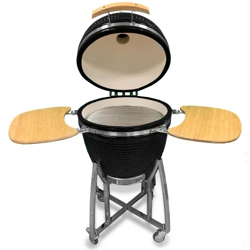 Верхние и нижние вентиляционные отверстия позволяют управлять поступающим потоком воздуха для поддержания желаемого жара. Верхний элемент дымоотвода выполнен из чугуна. Керамическая чаша с колосником для древесного угля располагается в основании гриля. На чашу устанавливается высокопрочная нержавеющая стальная решетка. Гриль оборудован термометром, который помогает следить за температурным режимом. Бамбуковая ручка и столешницы делают эксплуатацию гриля максимально удобной и практичной.