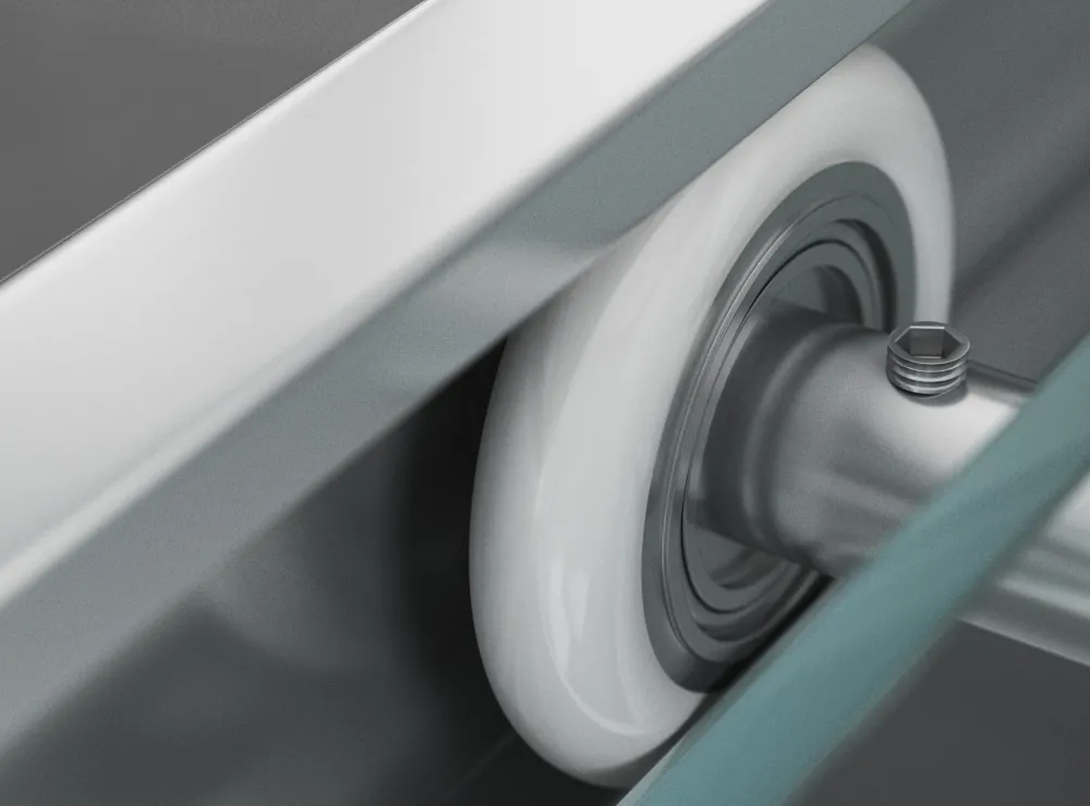 Раздвижные двери функционируют за счет колесиков и нержавеющих подшипников, которые передвигаются в специальных пазах. Механизм роликов препятствует заеданию и перекосу его подвижных частей. Легким нажатием створки можно отклонить или полностью вынуть, таким образом произвести генеральную уборку ограждения и тяжелодоступных мест душевого пространства.